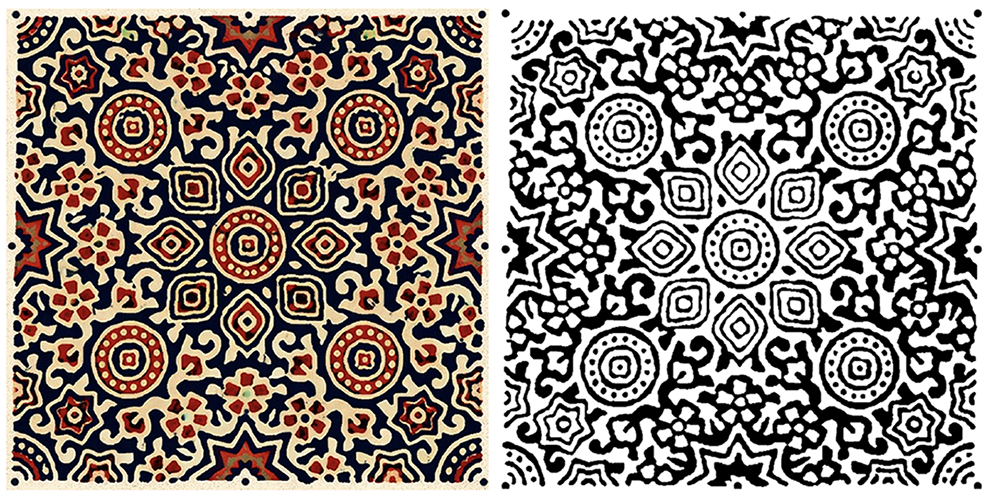 This exploratory motif analysis has various significant limitations. The six motifs are not a representative sample and might not reflect the entire variety of Ajrak designs; other designs might exhibit other proportional characteristics. In addition, we obtained our measurements based on 2D digital images; pixel rounding or perspective errors might have slightly influenced the ratios we estimated. According to one of the artisans, machine-printed reproductions do not have the human touch; likewise, digitized photographs have the potential to add small geometric errors (folding, camera angle, image resolution).