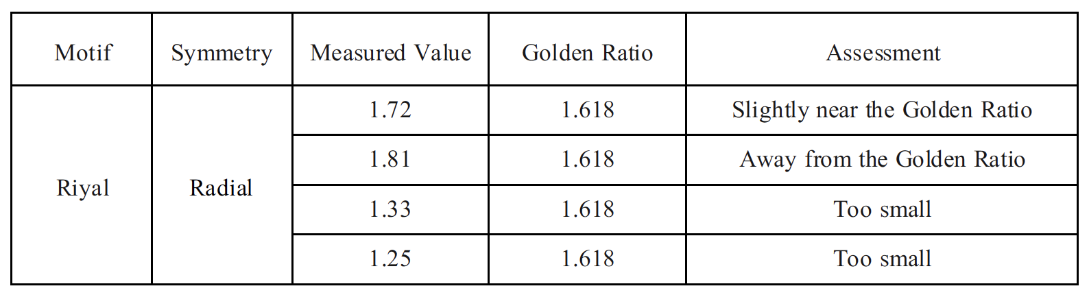 The measured proportions of the Riyal motif exhibit limited alignment with the golden ratio, with only one value falling slightly near φ, while the remaining measurements deviate from the reference value (Table 1).