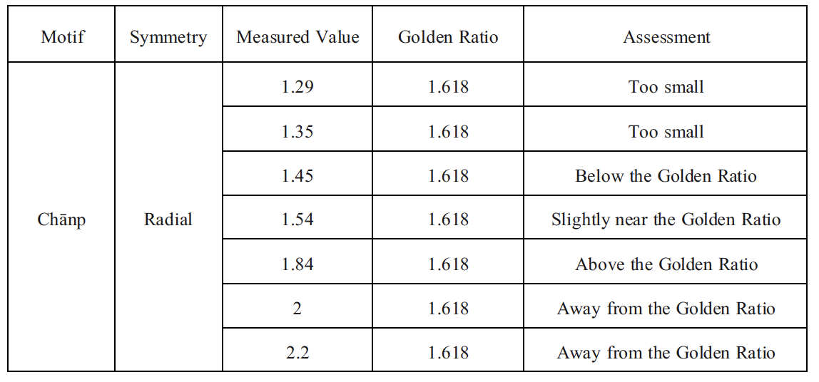 The measured proportions of the Chānp motif largely deviate from the golden ratio, with only one value (1.54) falling slightly near φ, while the remaining measurements are either below or significantly above this reference value (Table 2). Values within approximately ±0.1 of the golden ratio (1.618) were considered “slightly nearby.”