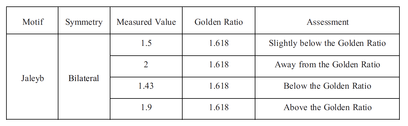 The Jaleyb motif does not exhibit proportional alignment with the golden ratio, as all measured values deviate either above or below φ, with none falling within a close approximation (Table 3). Measured values within approximately ±0.1 of the golden ratio were considered slightly nearby.