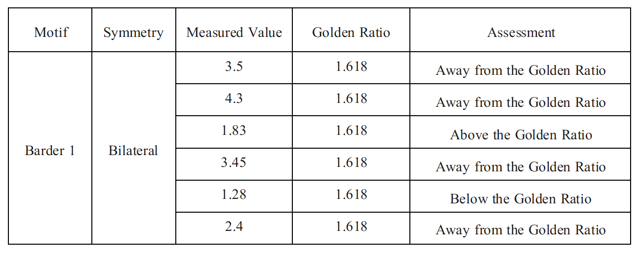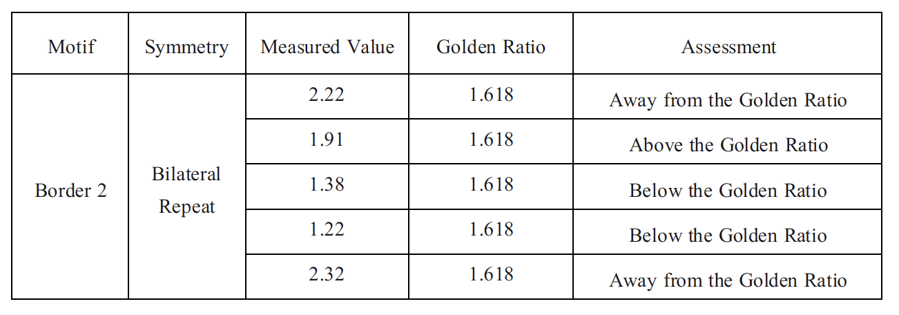 The Border 1 bilateral motif demonstrates substantial deviation from the golden ratio, with all measured proportions either significantly exceeding or falling below φ, indicating a lack of proportional alignment (Table 5). Values within approximately ±0.1 of the golden ratio were considered slightly near, and no Border 1 measurements fell within this range.